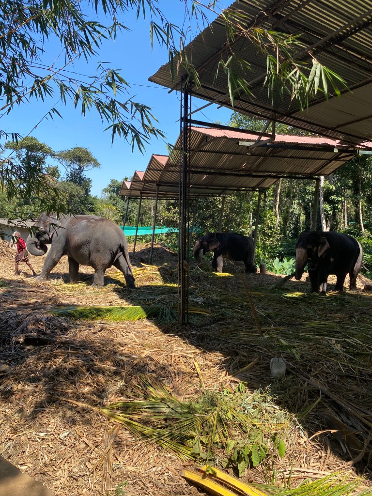 En una de las curvas los carros se detuvieron frente a un gran portón de metal. Esperamos unos momentos y abrieron las puertas para darnos paso a la propiedad. Entramos y pudimos ver a tres elefantes bajo una especie de toldos altos hechos de zinc, tranquilamente disfrutando de la sombra.