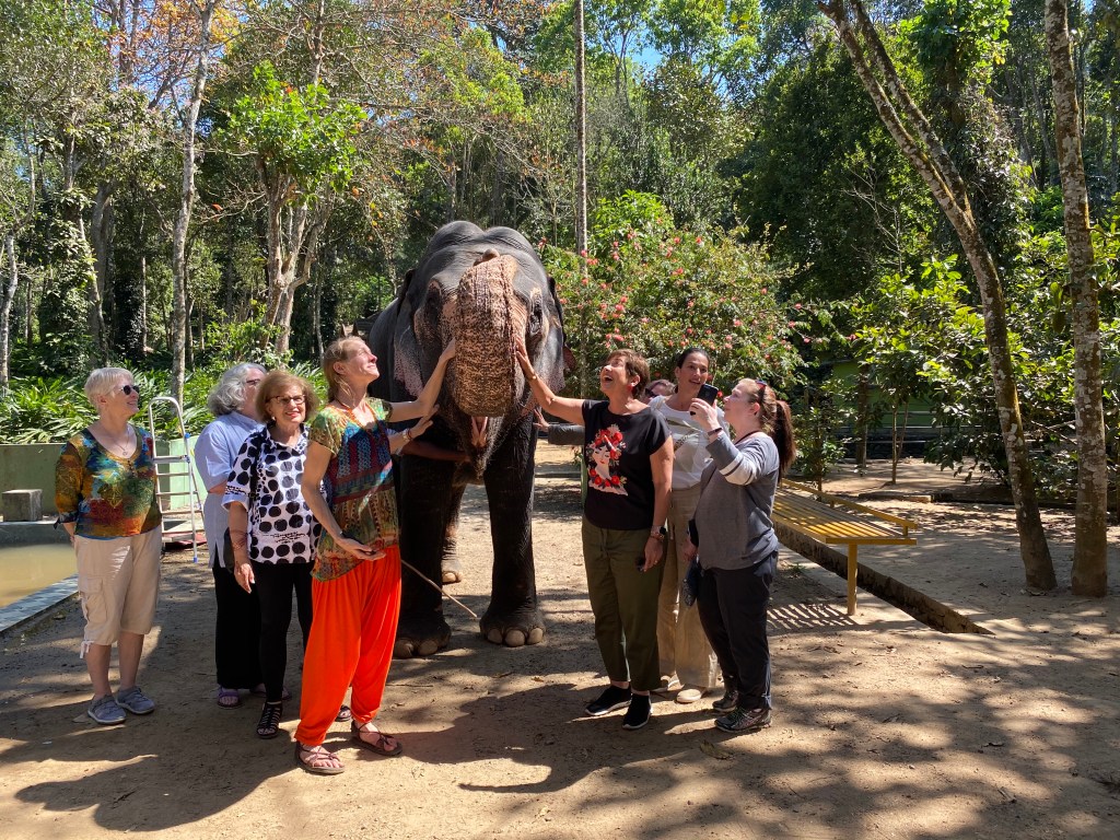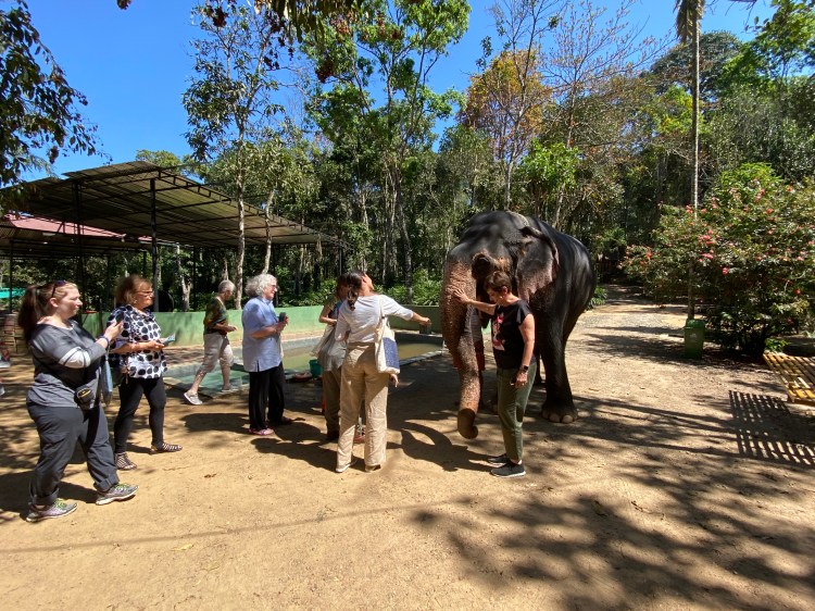 Nos dijeron que cuando los elefantes terminaran de comer, los cuidadores llevarían uno de ellos a una zona despejada. A los pocos minutos, con un paso lento, majestuoso el elefante llegó al sitio donde estábamos esperándolo. Finalmente fue momento de tocarlo, de retratarlo, de retratarnos con él.