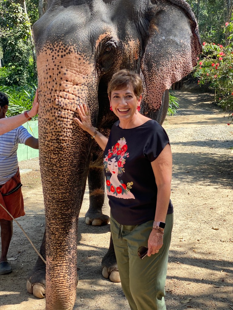 Allí estuvimos un buen rato, encantadas, tocándole la trompa, observando la piel, sintiéndola. La piel era gruesa, pero suave y me llamó la atención que tenía la trompa, parte de la cabeza y las orejas en un tono más claro, al igual que el elefante del templo de Ganesh en Puducherry. Pregunté y me explicaron que es una especie de vitíligo de los elefantes. Después me enteré de otras cosas muy interesantes.