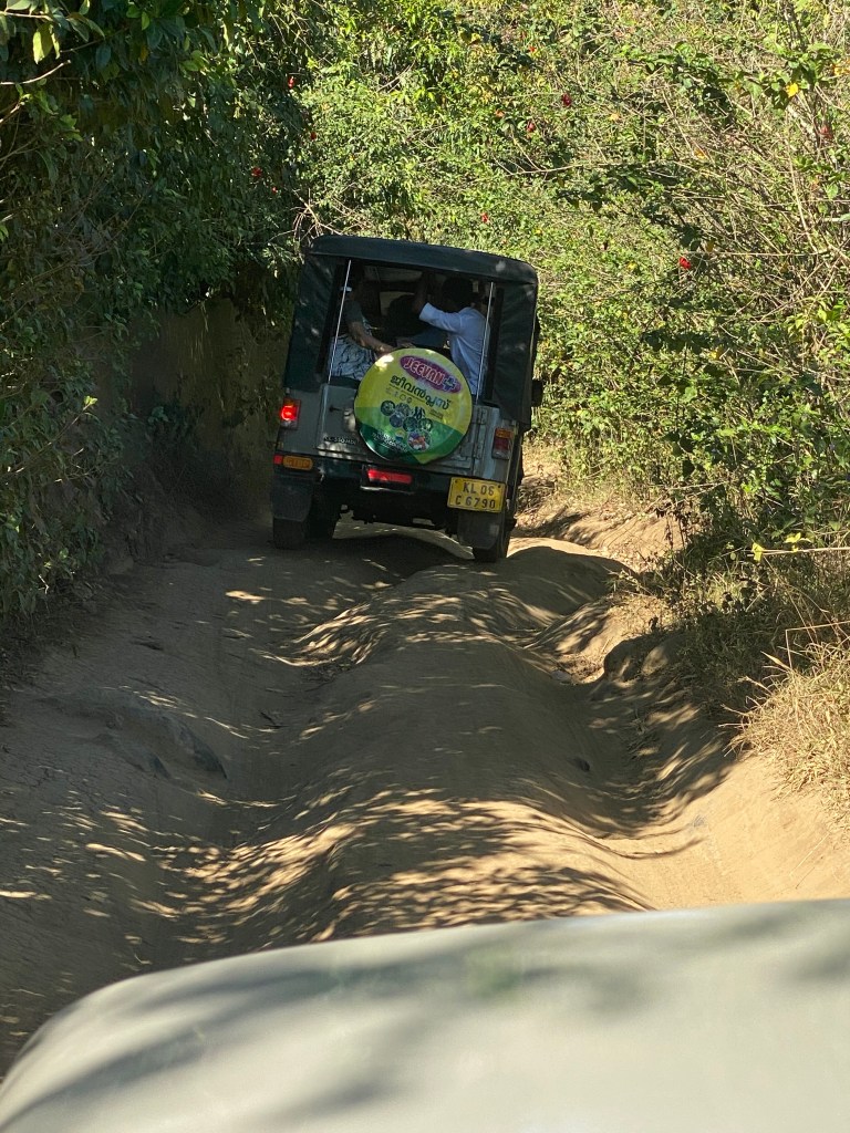 Almorzamos delicioso y después de una breve pausa, salimos en dos todoterreno pequeños rumbo a la aventura. No teníamos detalles de lo que nos esperaba y estábamos muy entusiasmadas. Transitamos por las calles de Thekkady durante unos minutos y luego empezamos a tomar caminos cada vez mas angostos, mas empinados y en los cuales la tierra era cada vez mas irregular. Sentíamos que la aventura había empezado.