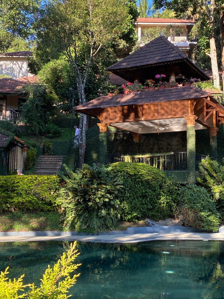 Llegamos al hotel con tiempo suficiente para refrescarnos y descansar un rato antes del espectáculo de artes marciales. Después del descanso nos reunimos cerca de la piscina. Mientras esperábamos que fuera la hora de salir, seguimos comentando sobre el día. Nieves y Cecilia acababan de tener un encuentro cercano con los monos, que abundaban en la colina donde está ubicado el hotel.