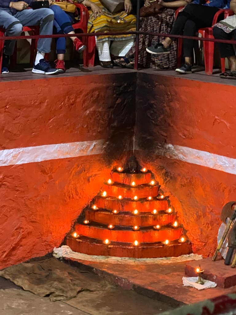 La base del cuadrilátero estaba situada casi dos metros por debajo de donde nos sentábamos nosotros. Las paredes estaban pintadas de rojo y en un extremos había una especie de candelabro hecho en cemento y formado por cuartos de círculo que se hacían más pequeños a medida que subían. En cada pequeño escalón había ofrendas y uno de los ejecutantes de la noche fue prendiendo varias velitas en cada círculo. En esa pared también estaba pintado una especie de escudo y descansaban una serie de armas que habían ido trayendo y acomodando con mucho cuidado. Había escudos, lanzas, espadas, hachas, unos palos largos y delgados y otras armas que no supe identificar.