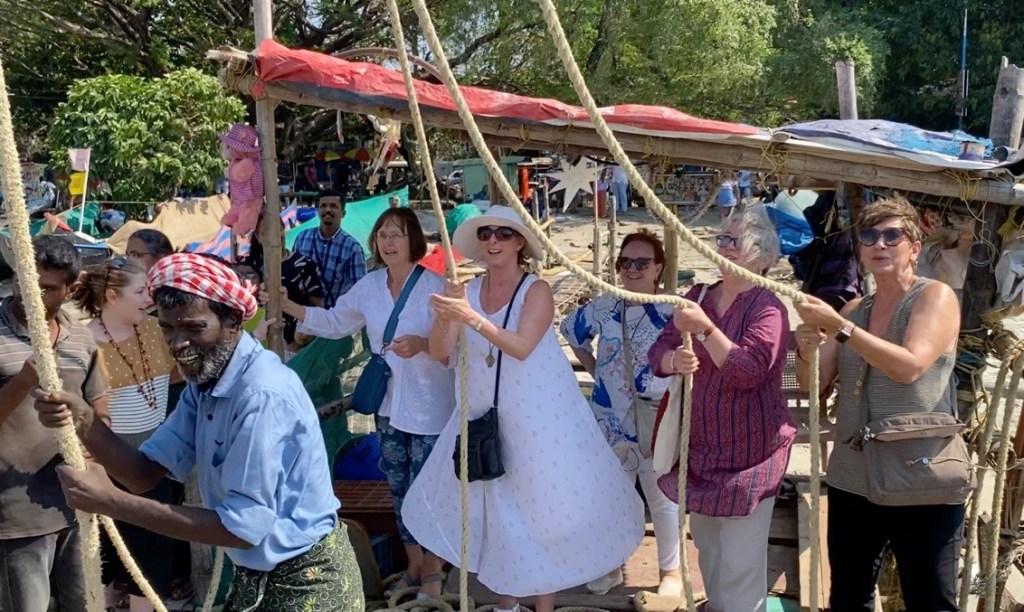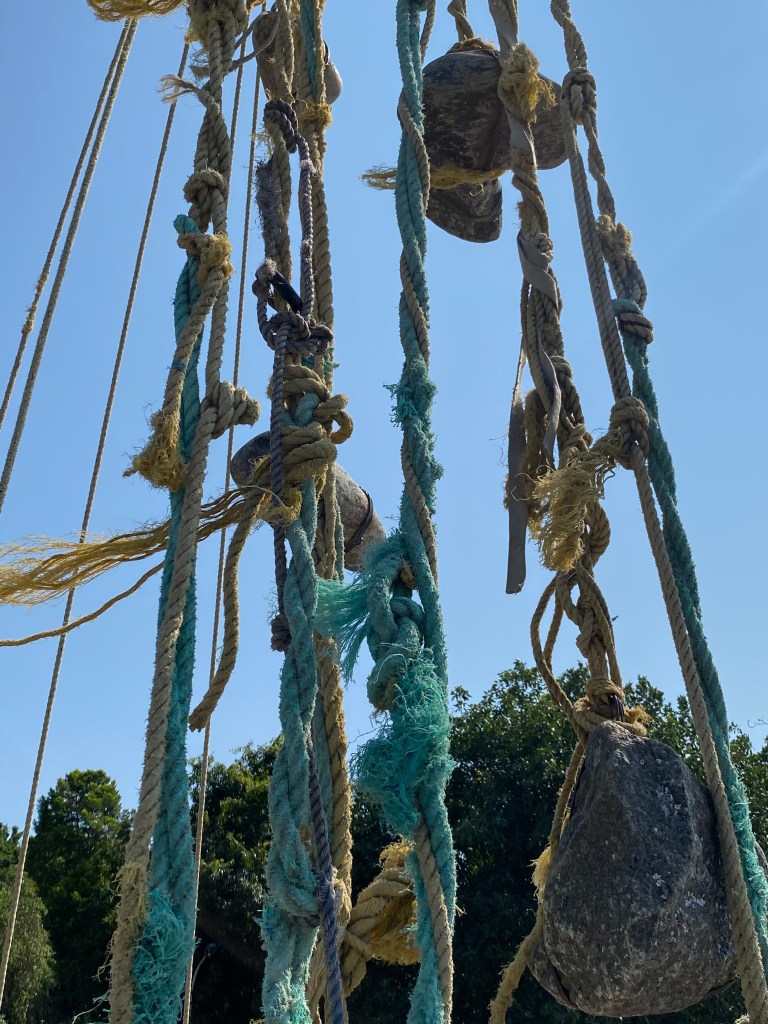 Ya desde el autobús habíamos visto las redes, lucían altas y vistosas. No teníamos ideas de cuál era el atractivo o qué íbamos a hacer. Nos fuimos acercando y encontramos a los pescadores tirando de cuerdas que tenían contrapesos en los extremos; seguíamos sin saber para que estábamos allí.