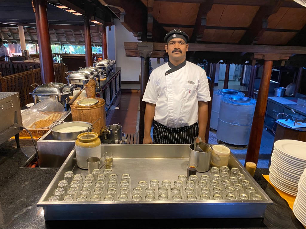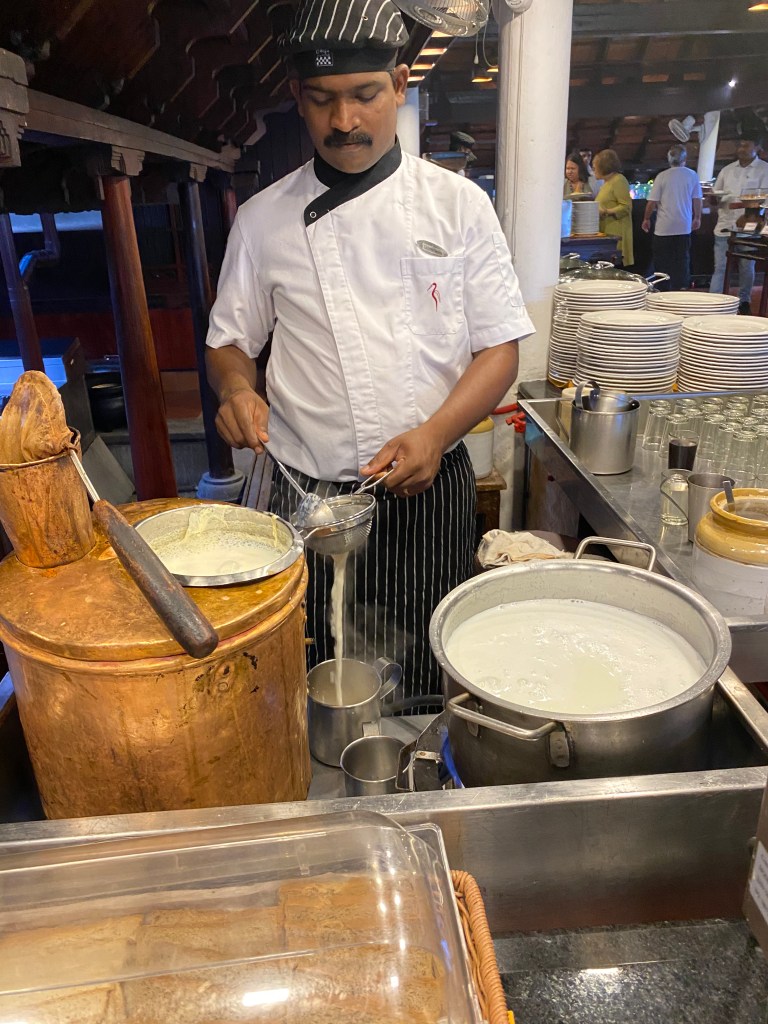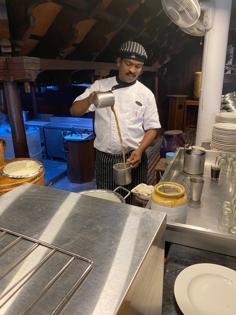 En el desayuno le puse especial atención al experto que preparaba el Masala Chai. Su lugar estaba en un extremo de uno de los patios de la antigua mansión, ahora restaurant principal del resort. Como no tomaba el chai, no me había acercado a él, pero esa mañana estaba sólo y me dedicó una demostración de su arte mezclando esta bebida tan popular entre mis compañeras y en toda India. En un post anterior les conté sobre la preparación.