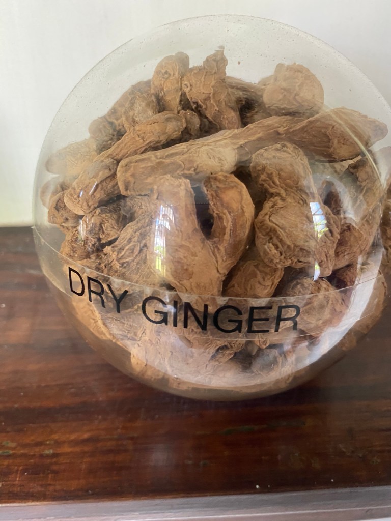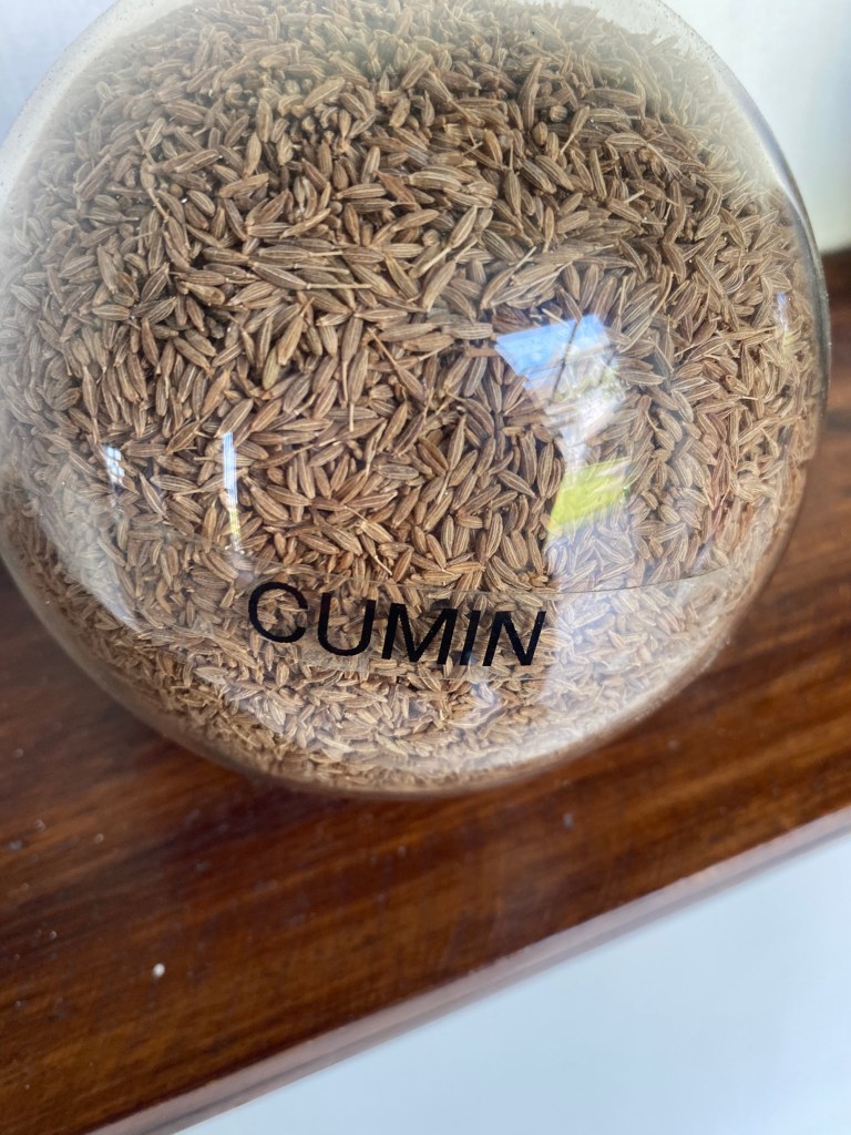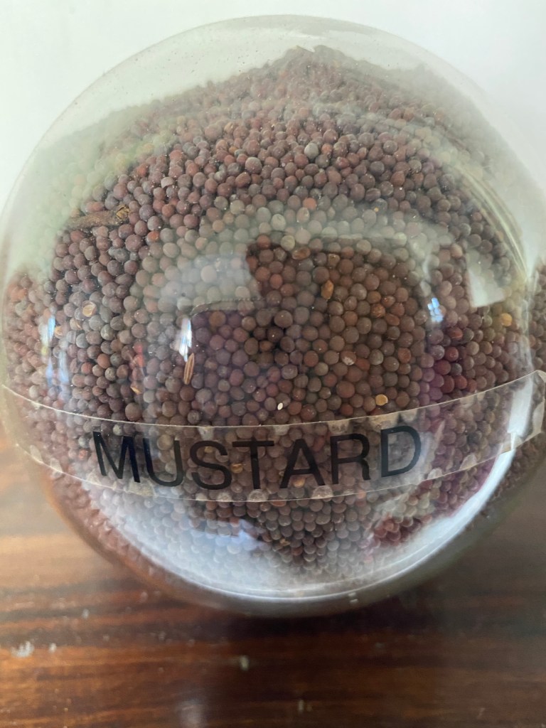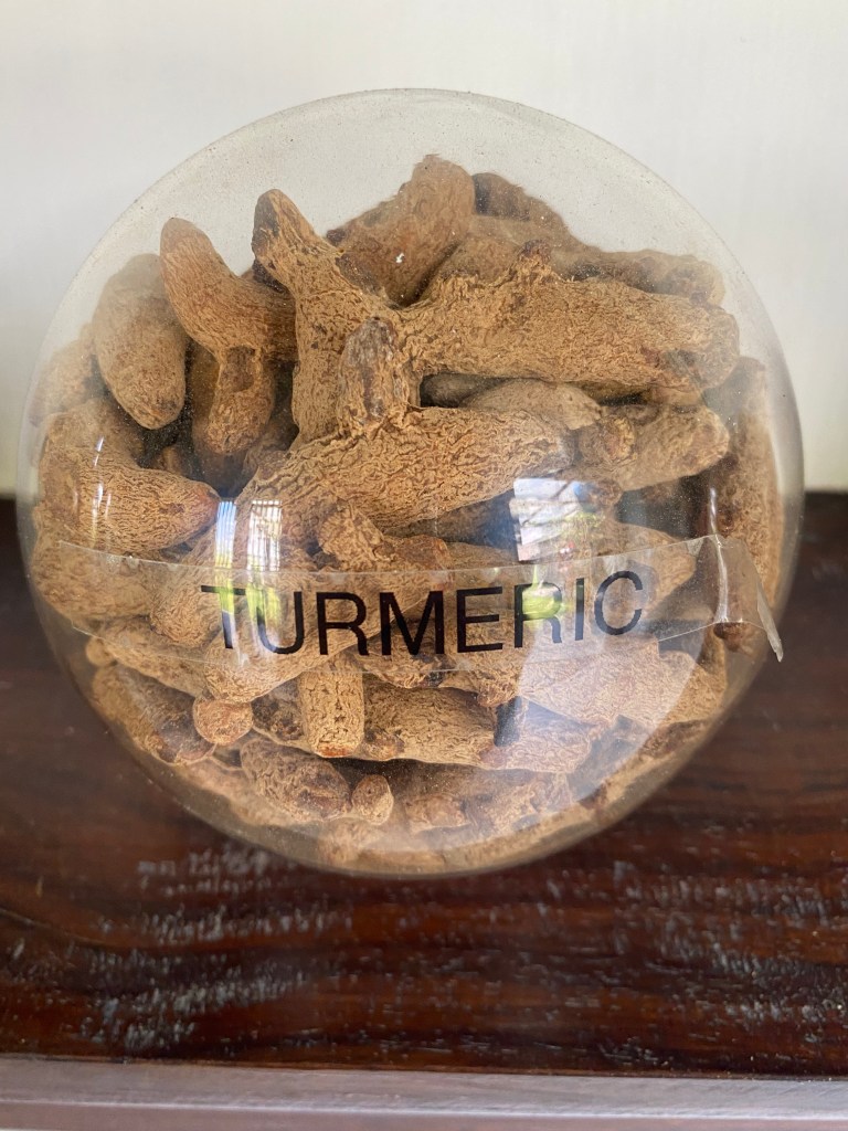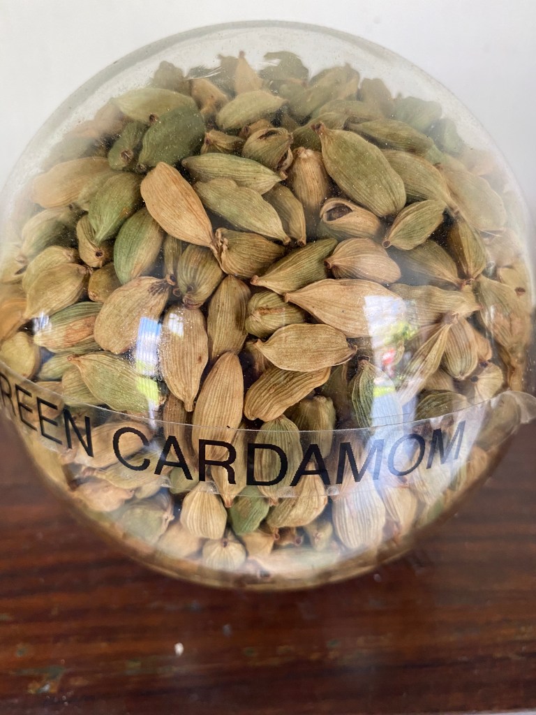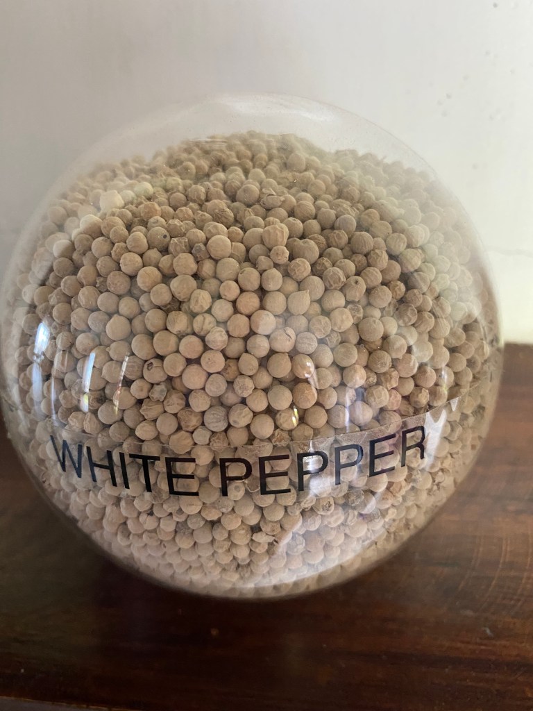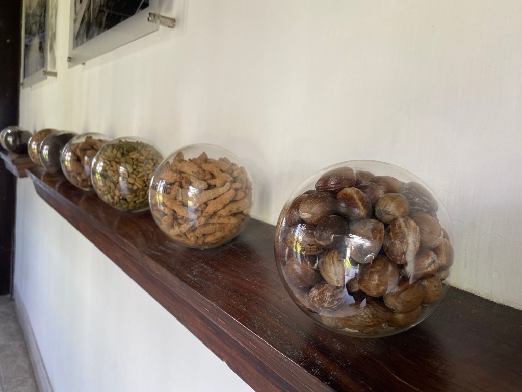 En la entrada tenían una serie de globos de vidrio colocados sobre una larga repisa de madera oscura, cada uno lleno de una especia diferente. Me pareció una manera muy original de recordar y resaltar la importancia de las especias en el origen y vida de la ciudad y la región. Allí me entretuve tomando fotos mientras era el momento de pasar a la mesa. Había canela, comino, clavos, cúrcuma, anís estrellado, nuez moscada, cardamón verde, jengibre seco, mostaza, pimienta blanca, pimienta negra.