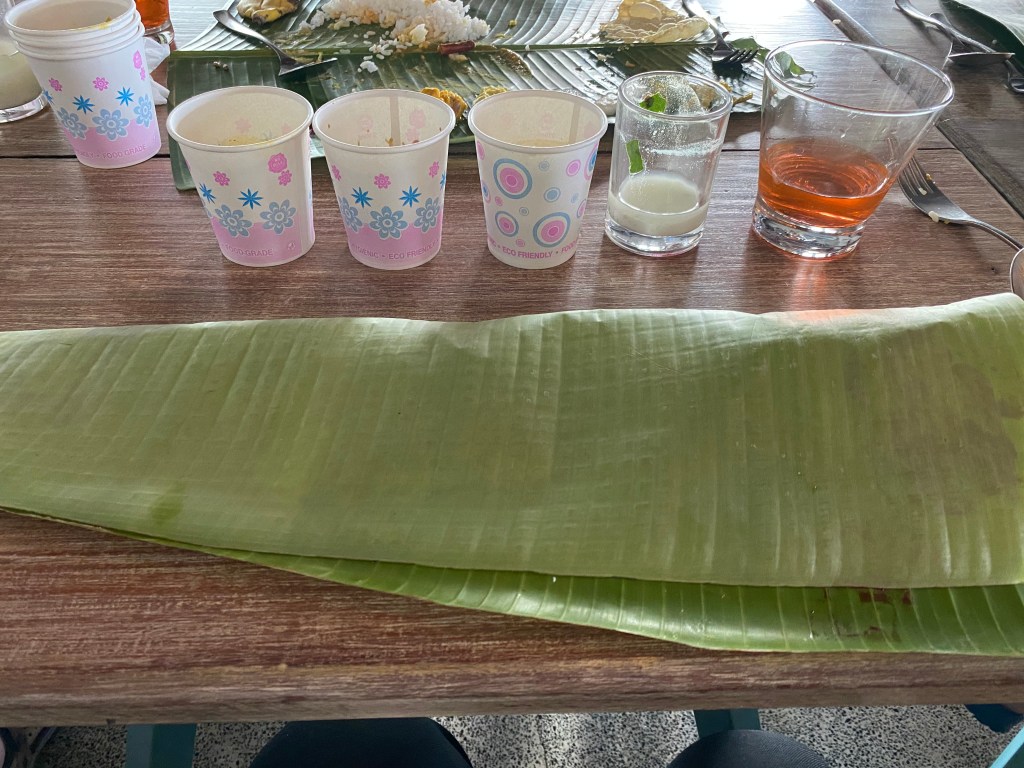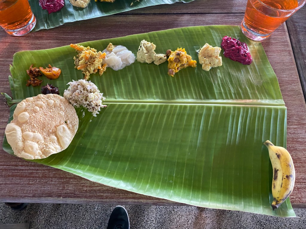 A la izquierda, en el extremo de la hoja tenía limón, mango y jengibre. Debajo de lo que parecía una torreja redonda, platanitos fritos cubierto con algo que no entendí pero que era delicioso. Me explicaron que lo que estaba colocado a lo largo de la hoja eran encurtidos que, a gusto, iría mezclando con la comida. Había varios con coco, había algo con remolacha, otra con piña, otra era repollo. También una preparación con batata y algo con calabaza. A la derecha un cambur.