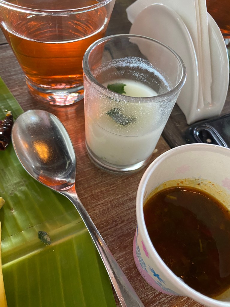 Mientras comíamos nos trajeron Moru. Resultó ser una bebida salada hecha de leche rica en grasa, jengibre, chile verde, hojas de curry, cebolla y sal. Resultó muy sabrosa.
