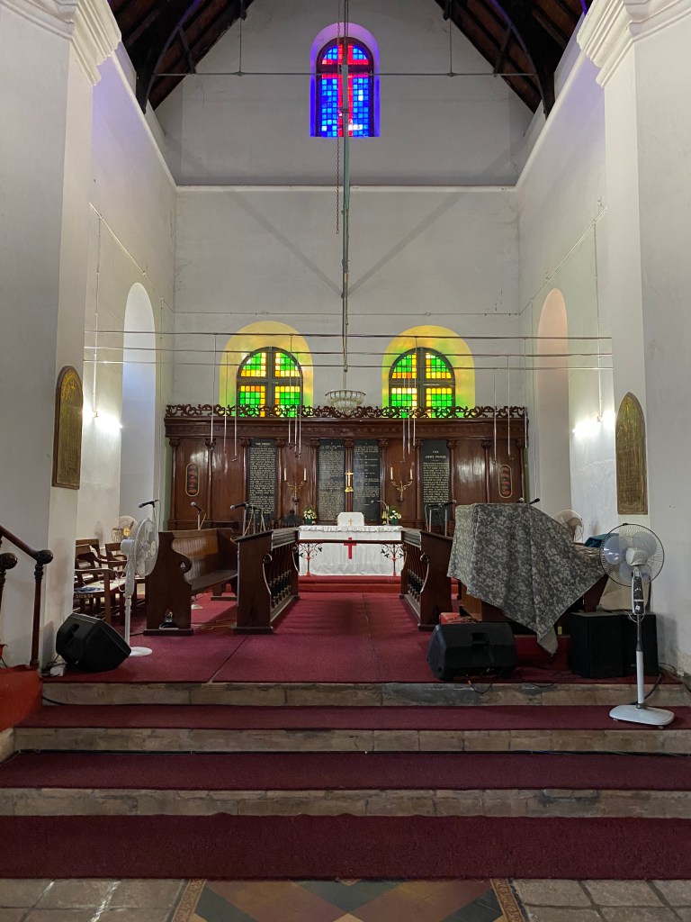Entramos a la iglesia la cual tiene un interior bastante sencillo. Después de escuchar la explicación del guía, me resultó muy interesante el hecho de que esta iglesia había sido testigo mudo de la historia de esta zona, incluso reflejo de las luchas y cambios que ocurrieron a lo largo de los siglos desde que Vasco da Gama y los conquistadores que le siguieron llegaron a esta parte de la India. Por siglos, el dominio de Cochin fue muy disputado entre las potencias comerciales de la época debido al volumen del comercio que se concentraba en este puerto.