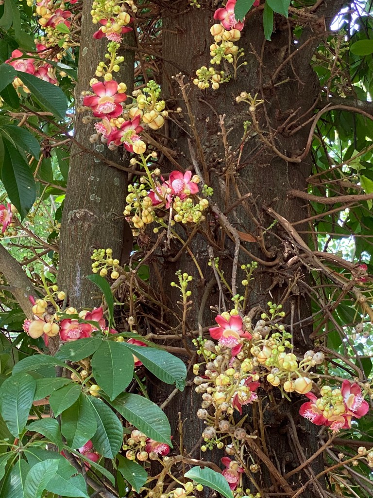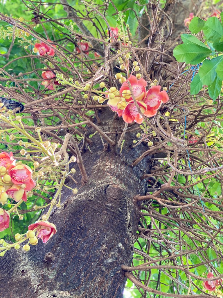 La flor es muy bonita y crece casi casi directamente desde el tronco. Resultó que también es un árbol originario de América, pero los hindúes lo consideran un árbol sagrado. En Asia las flores, que son exóticas y tienen un aroma agradable, son consideradas un símbolo de riqueza.