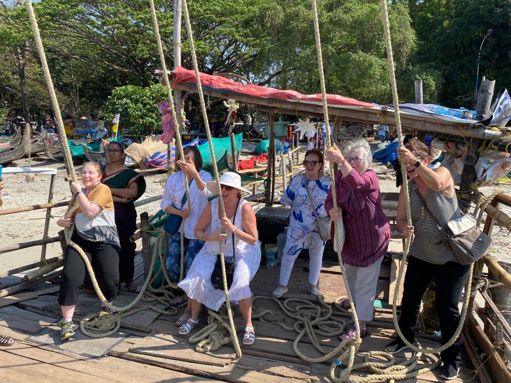 Caminamos un poco por la plataforma de madera sobre el agua y cuando ya todos estuvimos allí, nos invitaron a trabajar con las redes. Unas cuantas se quedaron observando, las otras nos colocamos donde nos indicaron, nos entregaron una cuerda a cada una y ¡a jalar!. El jefe del equipo gritaba para que tiráramos de la cuerda, nosotras le hacíamos caso y respondíamos el grito. «¡Opaaa!», «¡Ulala!», «¡Ulala!», … con una coordinación perfecta hasta que Renee, tiró con demasiada emoción y fue a tener al piso.