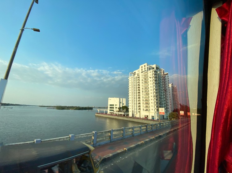 El viaje hasta el aeropuerto tardó casi dos horas y nos permitió observar, desde la ventana del autobús, distintos aspectos de la ciudad. Cochin está ubicada hacia el extremo norte de las Backwaters que habíamos visitado hacía un par de días y la ciudad está rodeada de islotes y canales lo que brinda un paisaje muy especial y muy agradable. Por donde fuimos pasando vimos mucha actividad y en la zona más cercana al agua había unos desarrollos residenciales bellísimos. No en vano Lonely Planet la incluyó entre las 10 primeras, de las ciudades en el mundo a visitar en 2020.